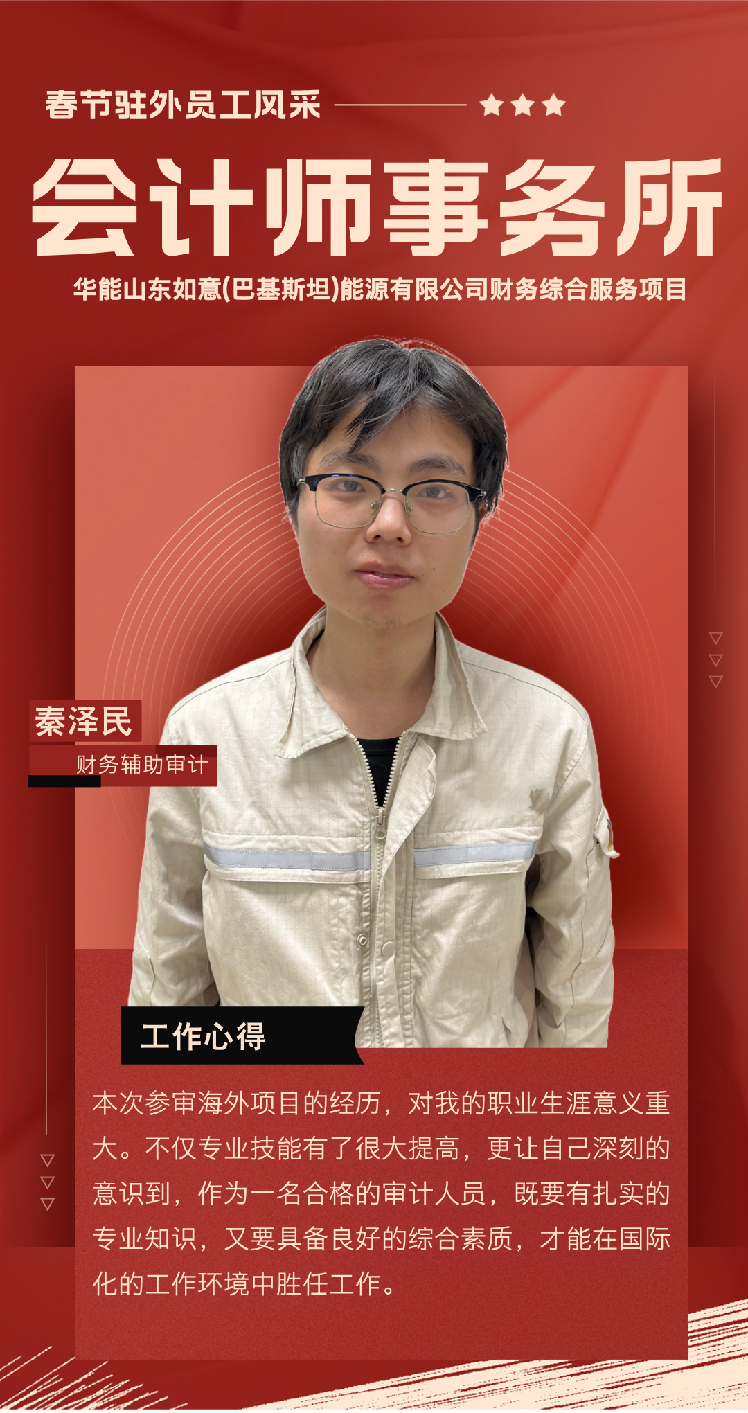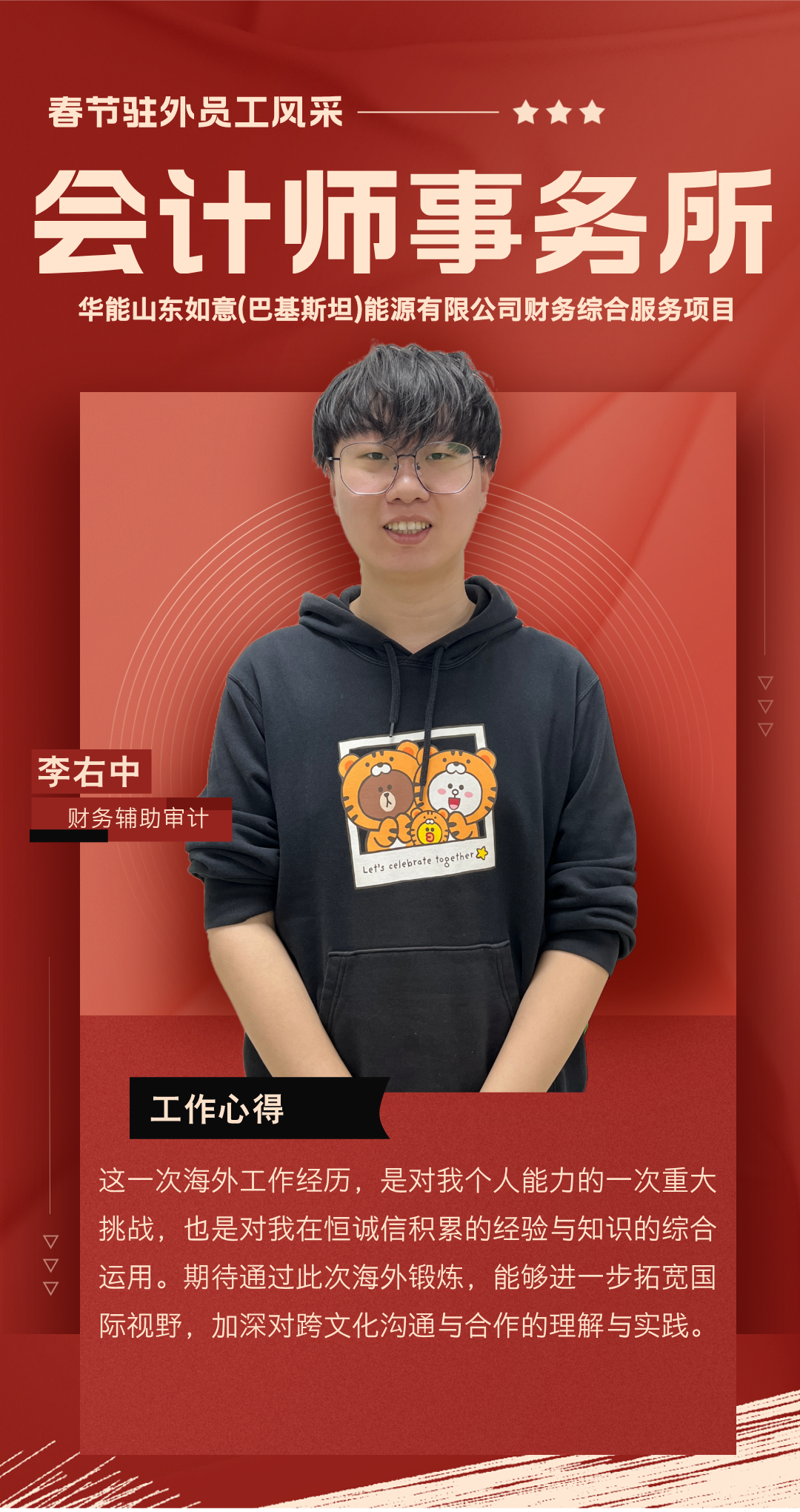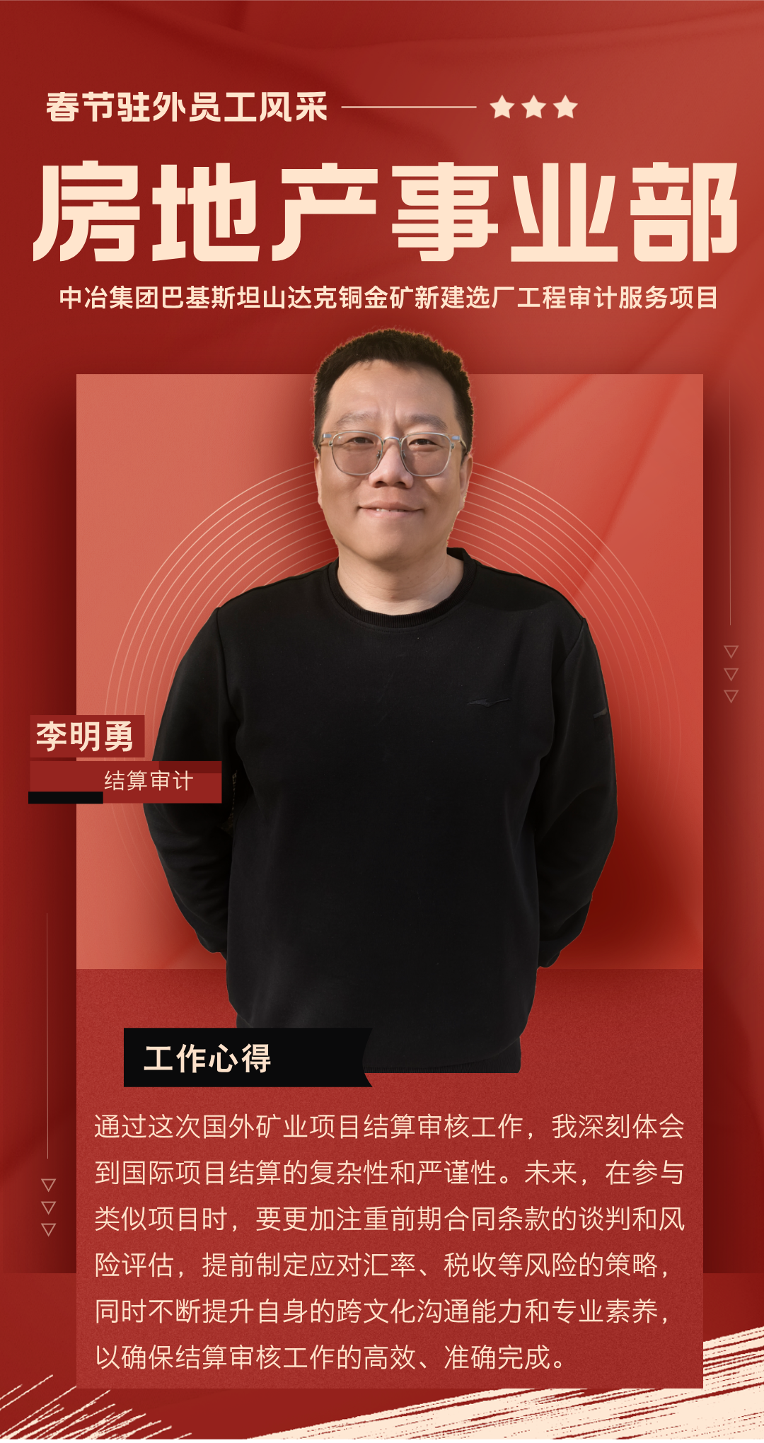 過去一年,你們背井離鄉(xiāng),奔赴海外項(xiàng)目一線,勇挑集團(tuán)賦予的重任,在異國他鄉(xiāng)的土地上默默耕耘。你們憑借扎實(shí)的專業(yè)知識,為項(xiàng)目的穩(wěn)步推進(jìn)筑牢根基;用非凡的智慧與辛勤的汗水,為公司贏得了良好聲譽(yù);更以實(shí)際行動,深刻詮釋了恒誠信人應(yīng)有的責(zé)任與擔(dān)當(dāng)。你們以精湛的專業(yè)服務(wù)在項(xiàng)目咨詢和審計(jì)工作中實(shí)現(xiàn)突破,樹立了恒誠信不畏艱險(xiǎn)、攻堅(jiān)克難、善作善成的企業(yè)品牌。廣大員工家屬識大體、顧大局,精心操持家庭、勇于承擔(dān)重負(fù),全力排解后顧之憂,給予駐外員工開拓進(jìn)取、再創(chuàng)佳績的信心與勇氣。